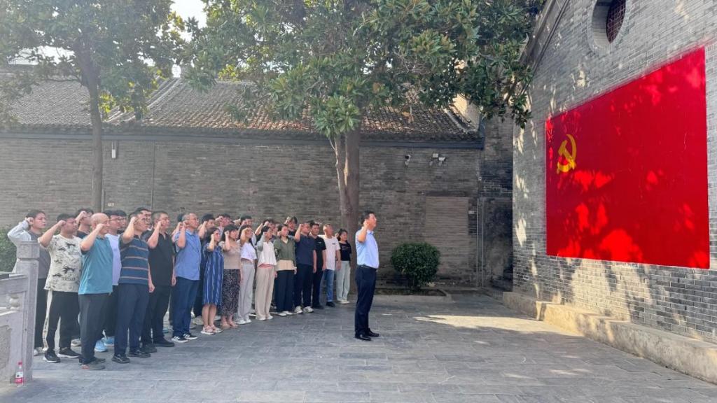 参观结束后,郭小平带领党员在党旗前整齐列队,面对党旗,高举右拳,庄严肃立,重温入党誓词。铮铮誓言,字字千钧,表达了对党坚定不移的忠诚和信念,彰显了为共产主义奋斗终身的决心和意志。