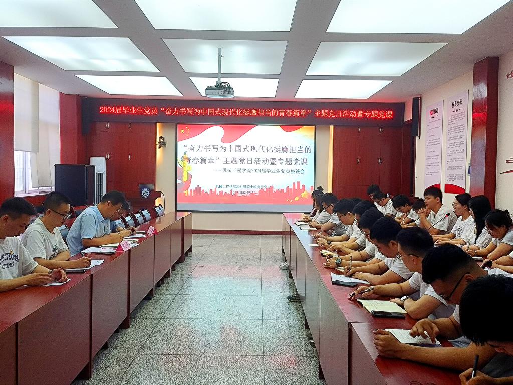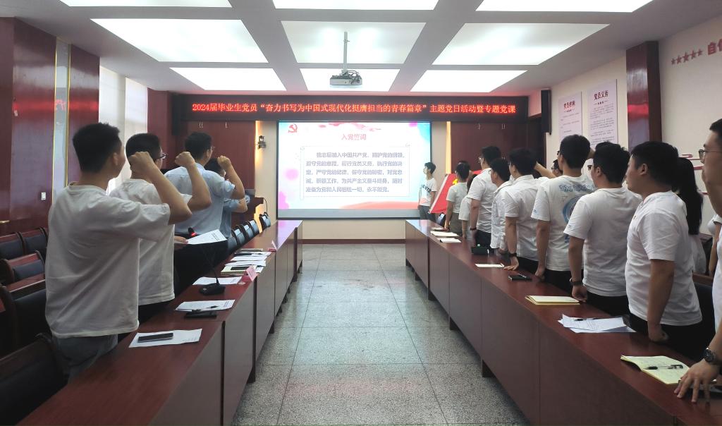 为深入学习贯彻党的二十大精神和习近平新时代中国特色社会主义思想,扎实推进党纪学习教育,进一步强化公司毕业生党员的党性修养,引导员工党员牢记身份、发挥先锋模范作用。6月21日下午,williamhill中国官方网站在雁塔校区机械楼210会议室召开“奋力书写为中国式现代化挺膺担当的青春篇章”2024届毕业生党员主题党日活动暨党纪学习教育专题党课。公司党委书记郭小平、副经理赵栓峰以及2024届硕、博士毕业生党员参加。支部书记张富强主持活动。